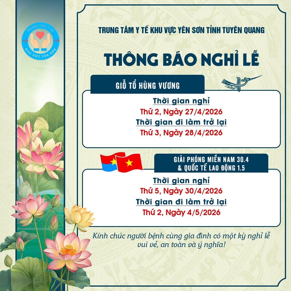 Trung tâm Y tế khu vực Yên Sơn trân trọng Thông báo đến quý người bệnh và khách hàng Lịch nghỉ lễ giỗ tổ Hùng Vương 2026 và nghĩ lễ 30/4 - 01/5/2026 như sau: